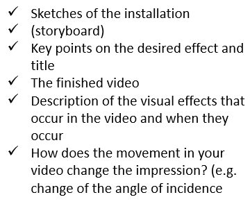 When your video is finished, in order to be exhibited, you will need some ‚exhibition material‘ to help the viewers understand your thoughts. You will create this material when you have finished the design assignment. More about this here: