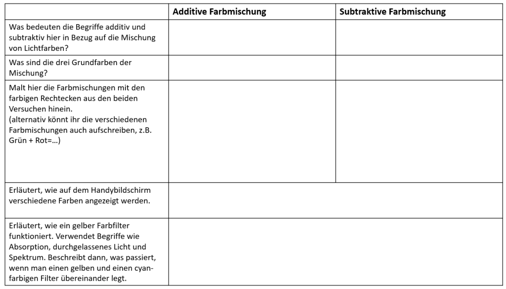 Aufgabe 2: Füllt nun mit dem Wissen aus den beiden Videos die folgende Übersicht. Diese braucht ihr später bei eurer eigenen Arbeit mit Farbmischungen. Tauscht euch dabei mit euren Gruppenmitgliedern aus und versucht euch ggf. gegenseitig zu helfen.