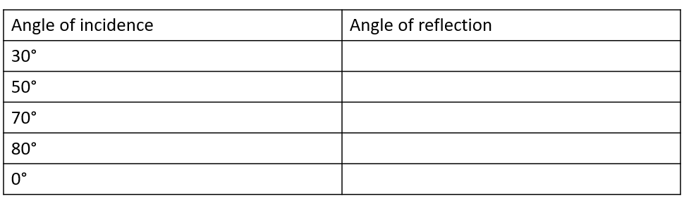 Task 3: Now successively set the experimental lamp to the angles of incidence in the following table and read the corresponding angle of reflection. Transfer the table to the appropriate place in your experiment protocol and enter the values you read. Complete the remaining points of the experiment protocol.